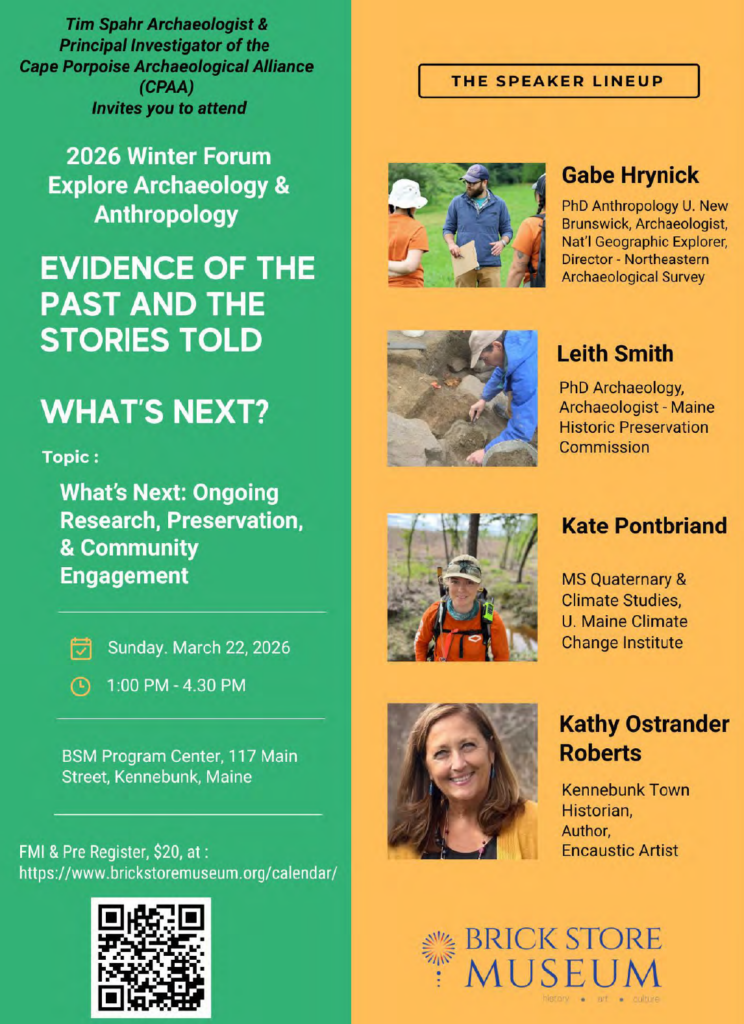 - Tim Spahr Archaeologist & Principal Investigator of the Cape Porpoise Archaeological Alliance (CPAA) invites you to attend the 2026 Winter Forum Explore Archaeology and Anthropology. Evidence of the past and the stories told: ongoing research, preservation, and community engagement.